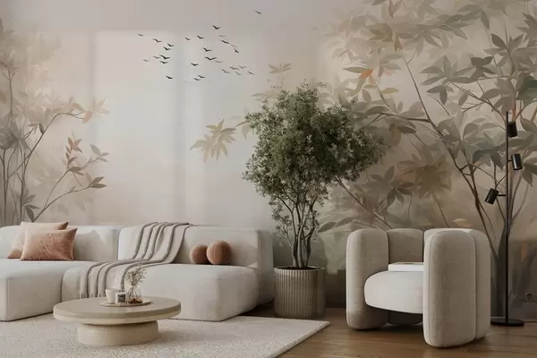 Fotomurales Paisaje texturizado con árboles y una bandada de pájaros volando en el cielo, colores pastel, escena natural Nr. w09418