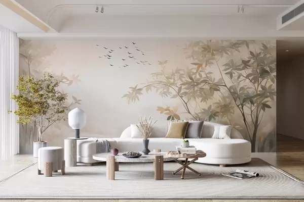 murales de pared Paisaje texturizado con árboles y una bandada de pájaros volando en el cielo, colores pastel, escena natural w09418