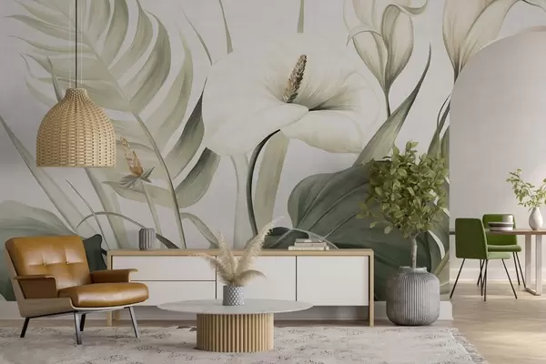 Fotomurales Calas blancas y hojas tropicales verdes, ilustración botánica, fondo claro, estilo vintage, texturizado Nr. w09423