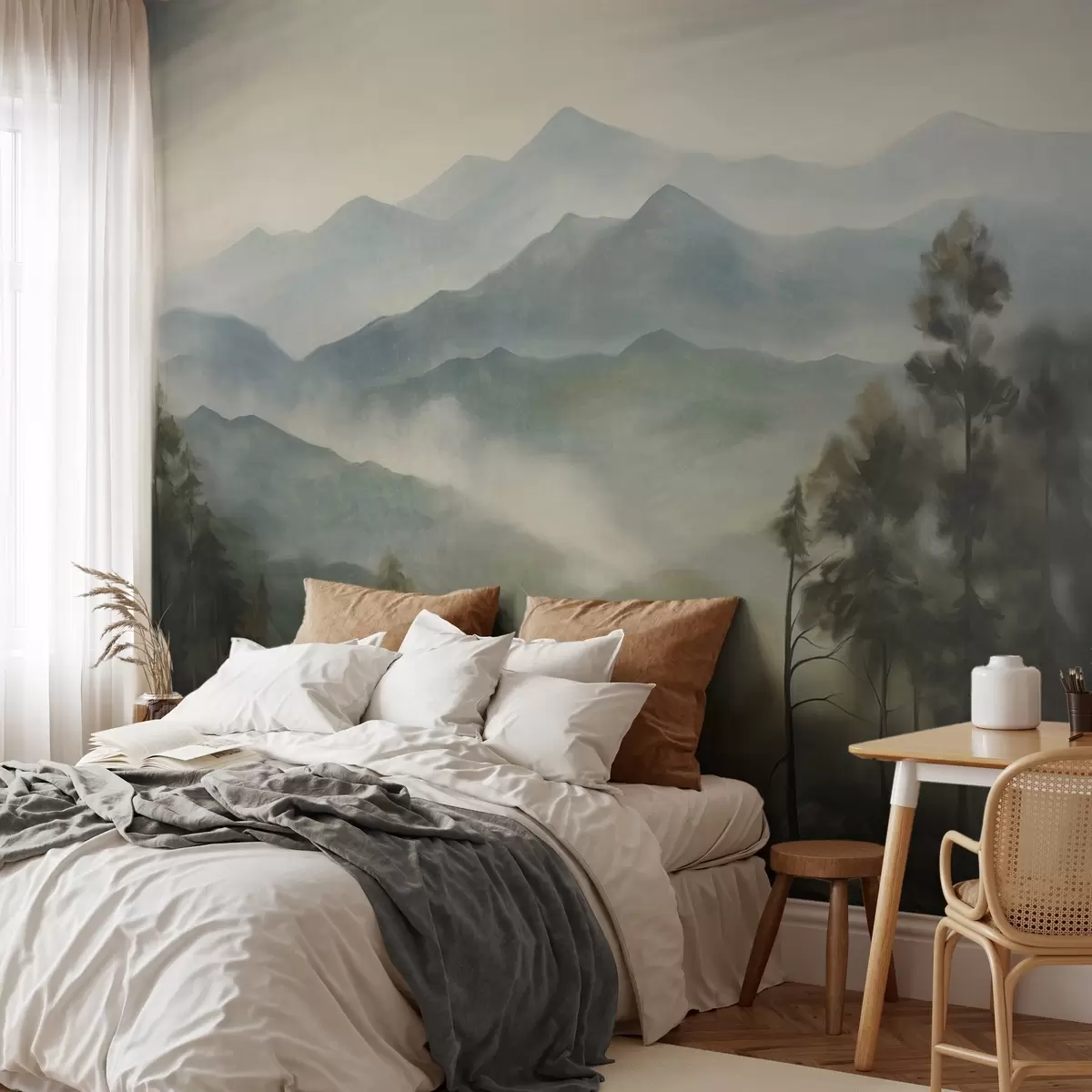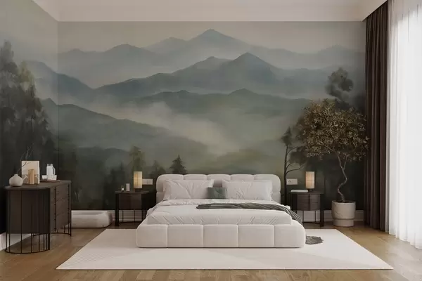 Fotomurales Cordillera brumosa con árboles, niebla, cielo nublado, colores apagados, estilo de pintura paisajística Nr. w09424