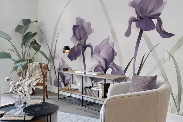 Fotomurales Flores de iris moradas con tallos verdes, estilo acuarela, fondo blanco, colores suaves, elegante, artístico Nr. w09425