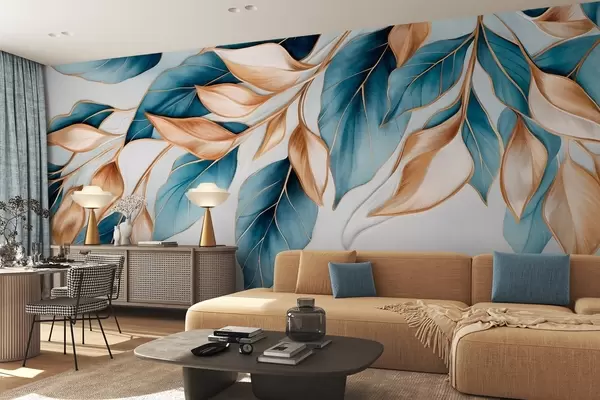 Fotomurales Hojas azules y naranjas con textura, fondo azul claro, diseño elegante y artístico, estilo moderno Nr. w09429
