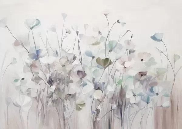 Fotomurales Campo abstracto de flores coloridas con tallos largos y hojas verdes, texturizado, colores pastel y claros Nr. w09466
