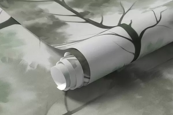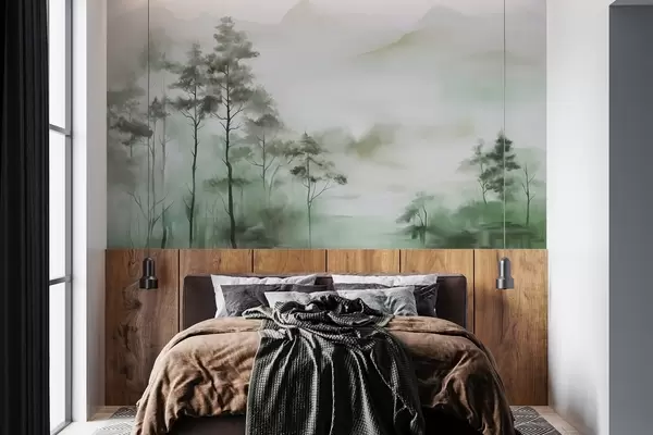 Fotomurales Paisaje brumoso con árboles altos y montañas en tonos verdes y grises apagados, estilo minimalista, texturizado Nr. w09469