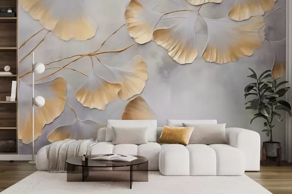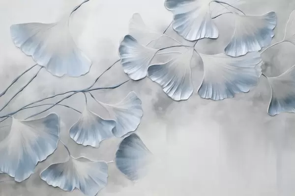 Fotomurales Hojas de ginkgo biloba con bordes amarillos en una rama, fondo gris texturizado, diseño elegante y minimalista Nr. w09472