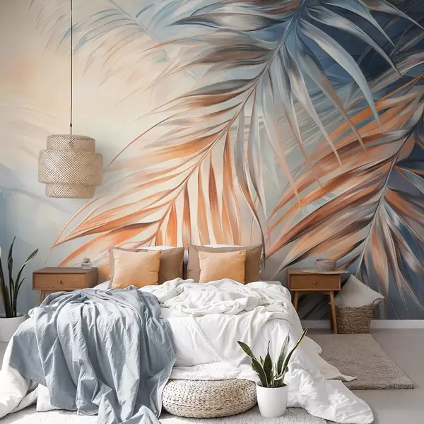 Fotomurales Hojas de palmera con tonos naranjas y azules, fondo con textura ligera y colores suaves, elegante estilo tropical Nr. w09475