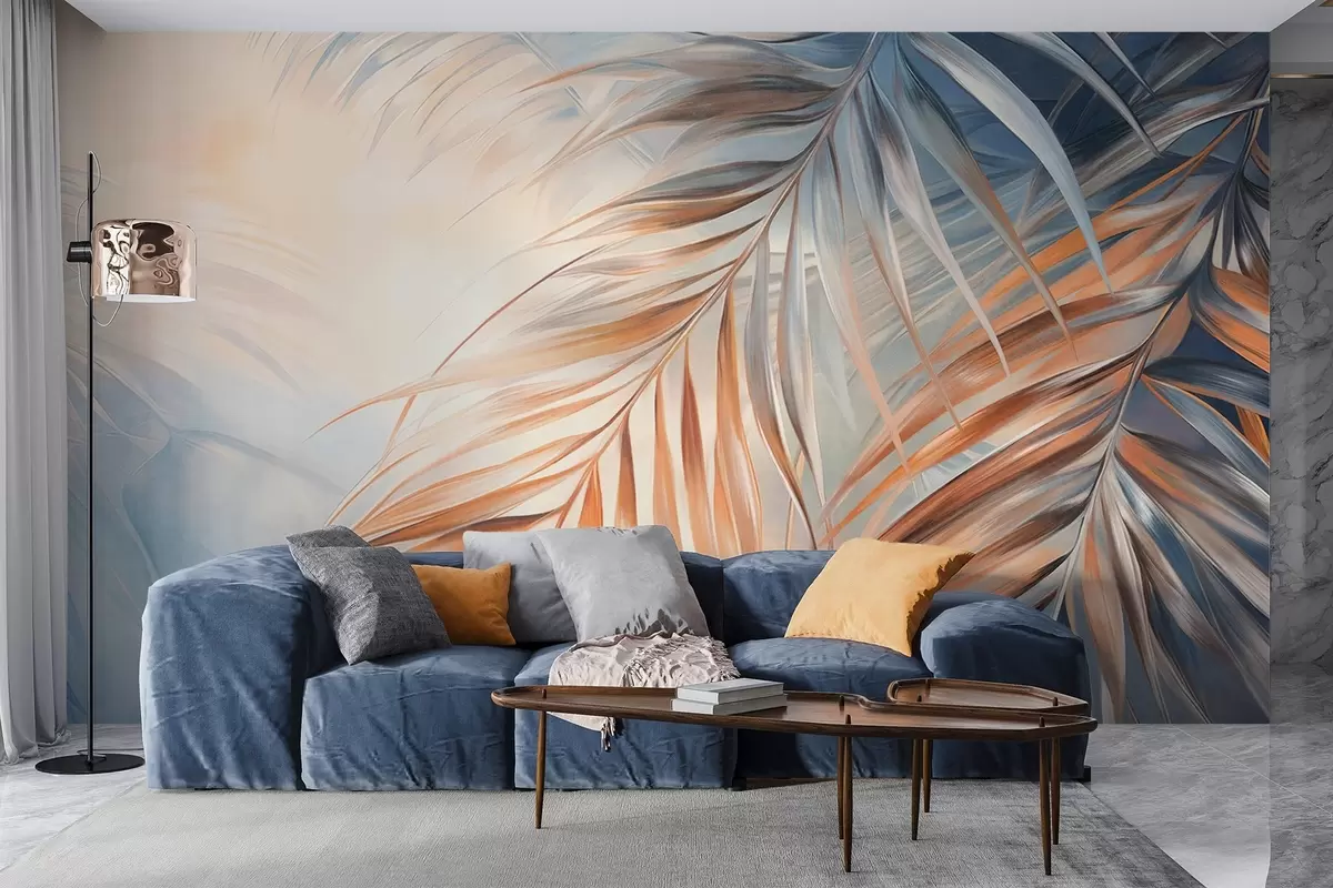 Fotomurales Hojas de palmera con tonos naranjas y azules, fondo con textura ligera y colores suaves, elegante estilo tropical Nr. w09475