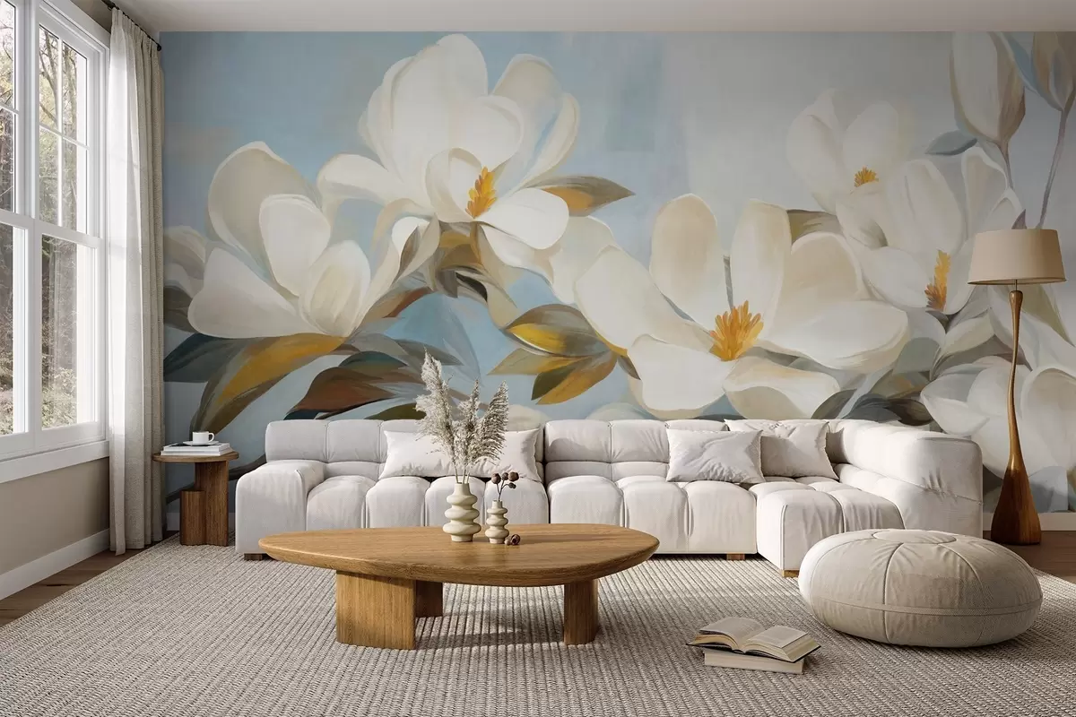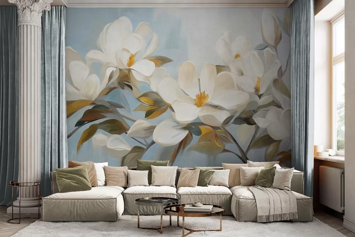 Fotomurales Magnolias blancas con hojas verdes sobre fondo azul claro con imitación de pinceladas abstractas. Nr. w09478