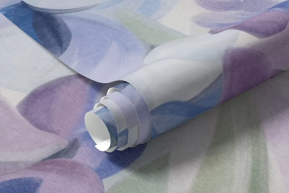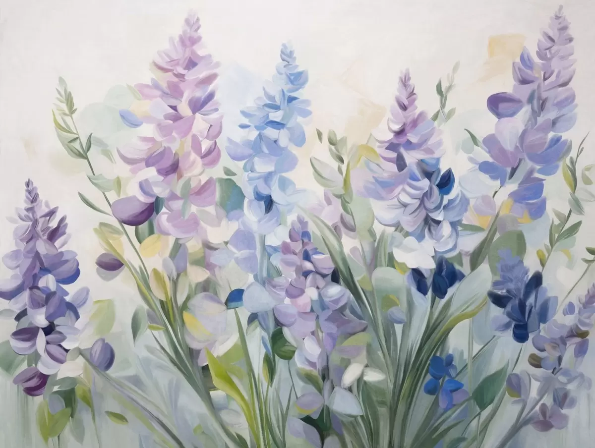 Fotomurales Flores moradas y azules con textura y hojas azules, fondo claro, pinceladas suaves, colores vibrantes Nr. w09482