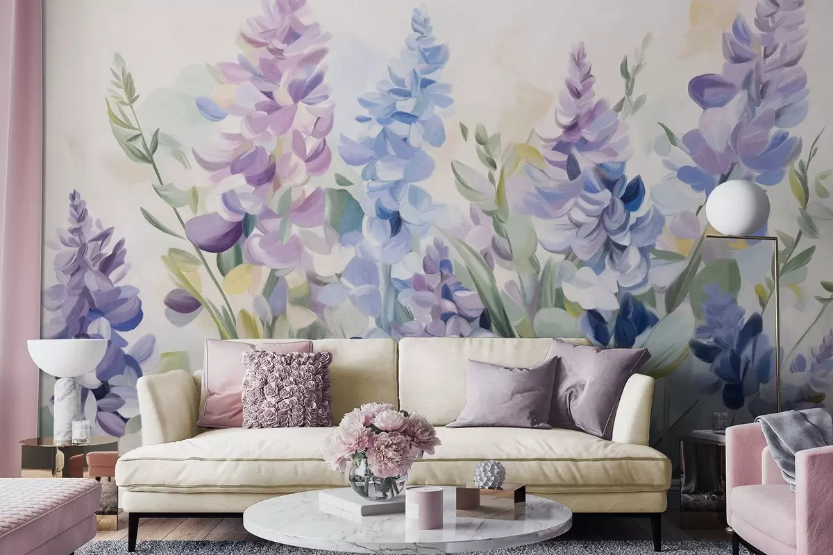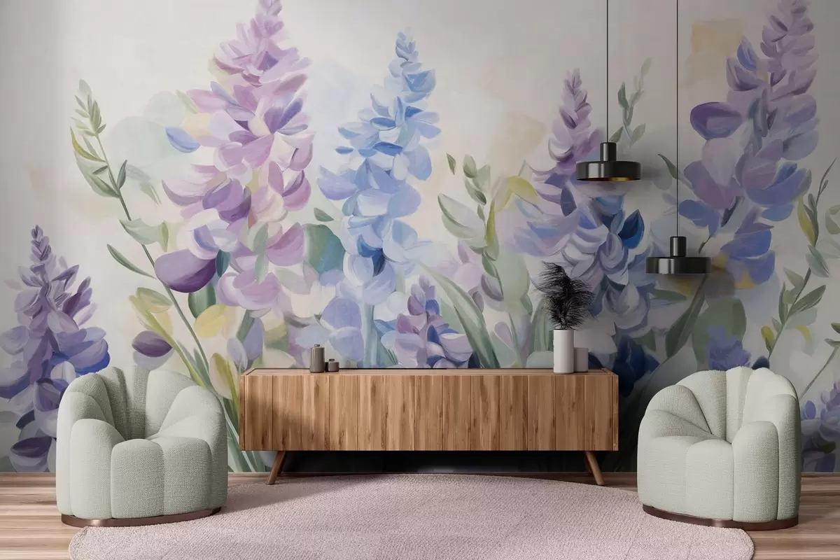 Fotomurales Flores moradas y azules con textura y hojas azules, fondo claro, pinceladas suaves, colores vibrantes Nr. w09482