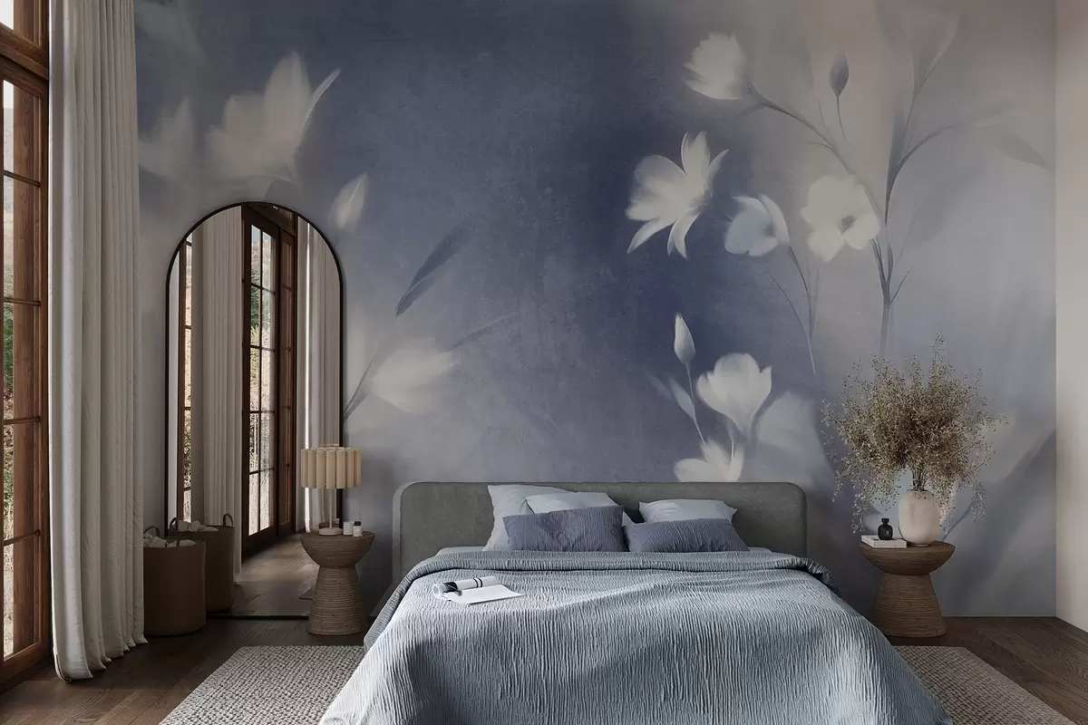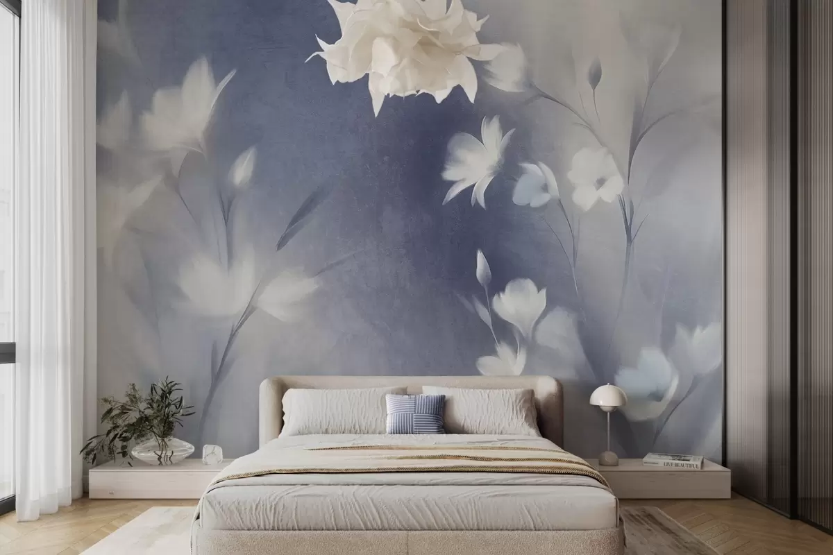 Fotomurales Flores blancas con textura y tallos largos, capullos suaves sobre un fondo difuminado de tonos azules y blancos Nr. w09484