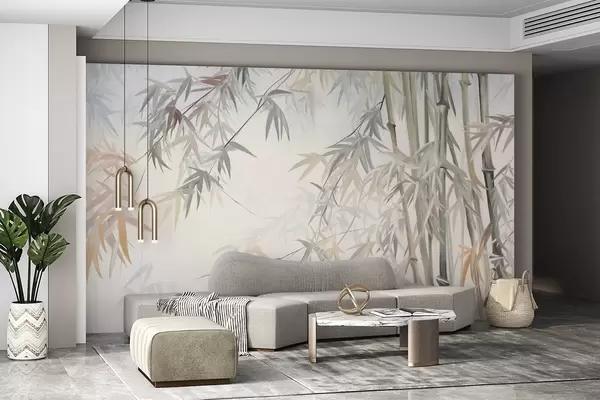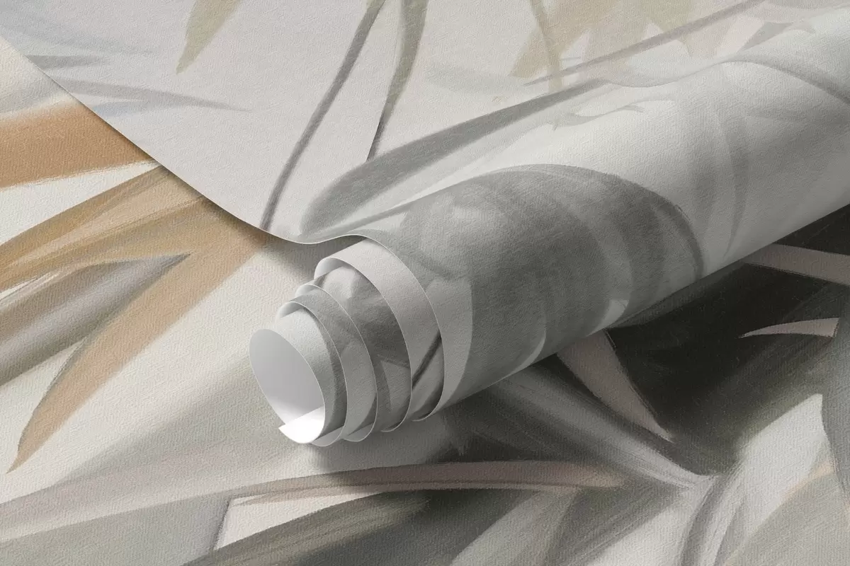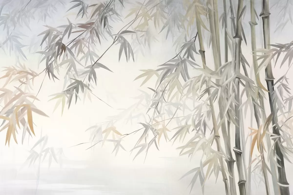 Fotomurales Tallos y hojas de bambú texturizados en una paleta de colores suaves y apagados de gris, blanco y crema, composición minimalista. Nr. w09485