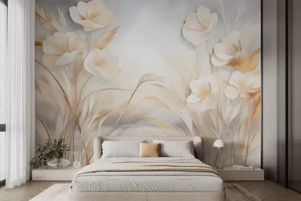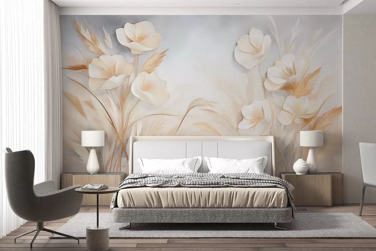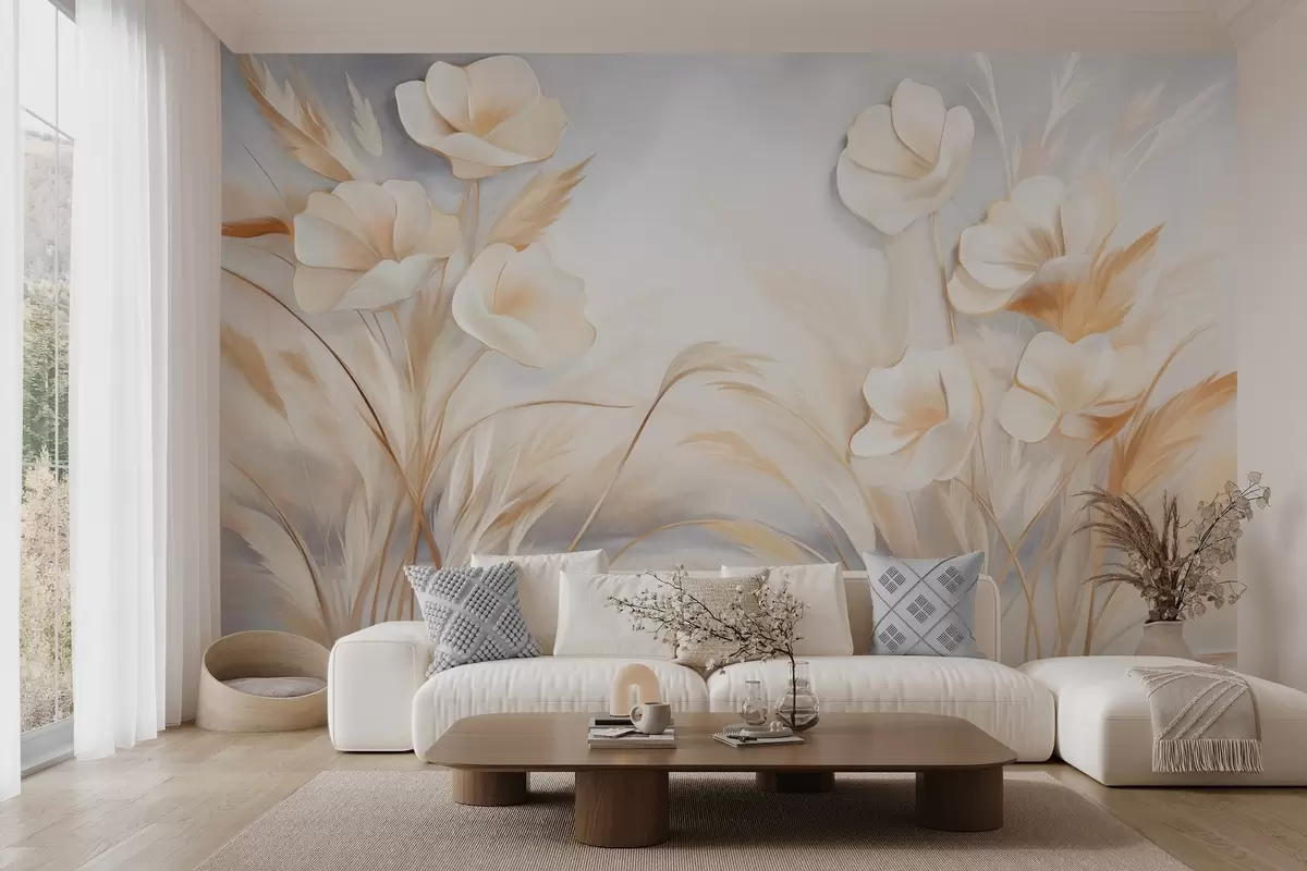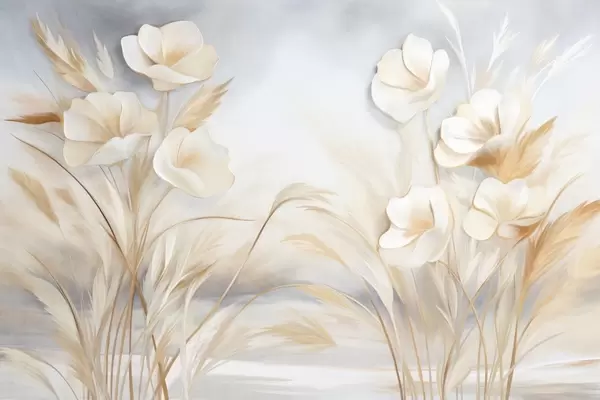 Fotomurales Flores blancas, juncos beige y hierba de la pampa, texturizado, elegante, estilo minimalista, fondo abstracto paisajístico Nr. w09490