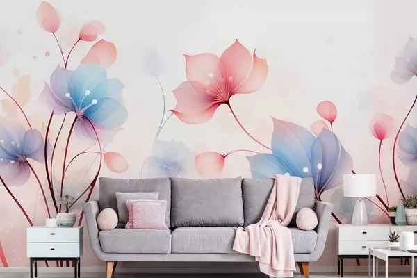 Fotomurales Delicadas flores rosa y azul: flora etérea sobre un fondo blanco acuarelado Nr. w09507