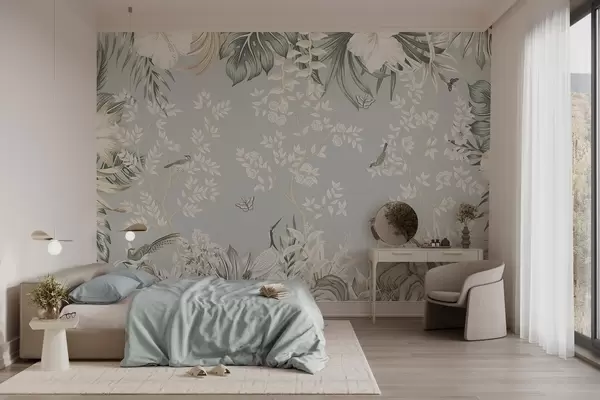 Fotomurales Arte tropical en tonos pastel con textura, con pájaros, mariposas, flores de hibisco, hojas de palmera y árboles sobre un fondo azul claro Nr. w09528