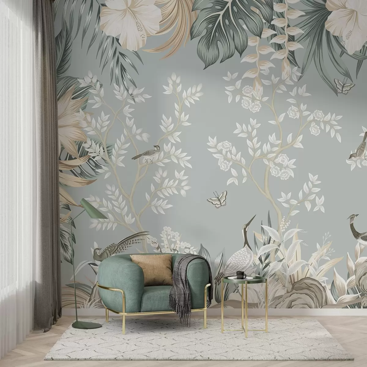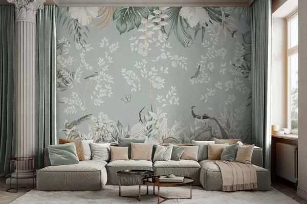 Fotomurales Arte tropical en tonos pastel con textura, con pájaros, mariposas, flores de hibisco, hojas de palmera y árboles sobre un fondo azul claro. Nr. w09528