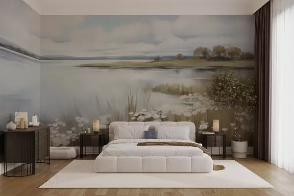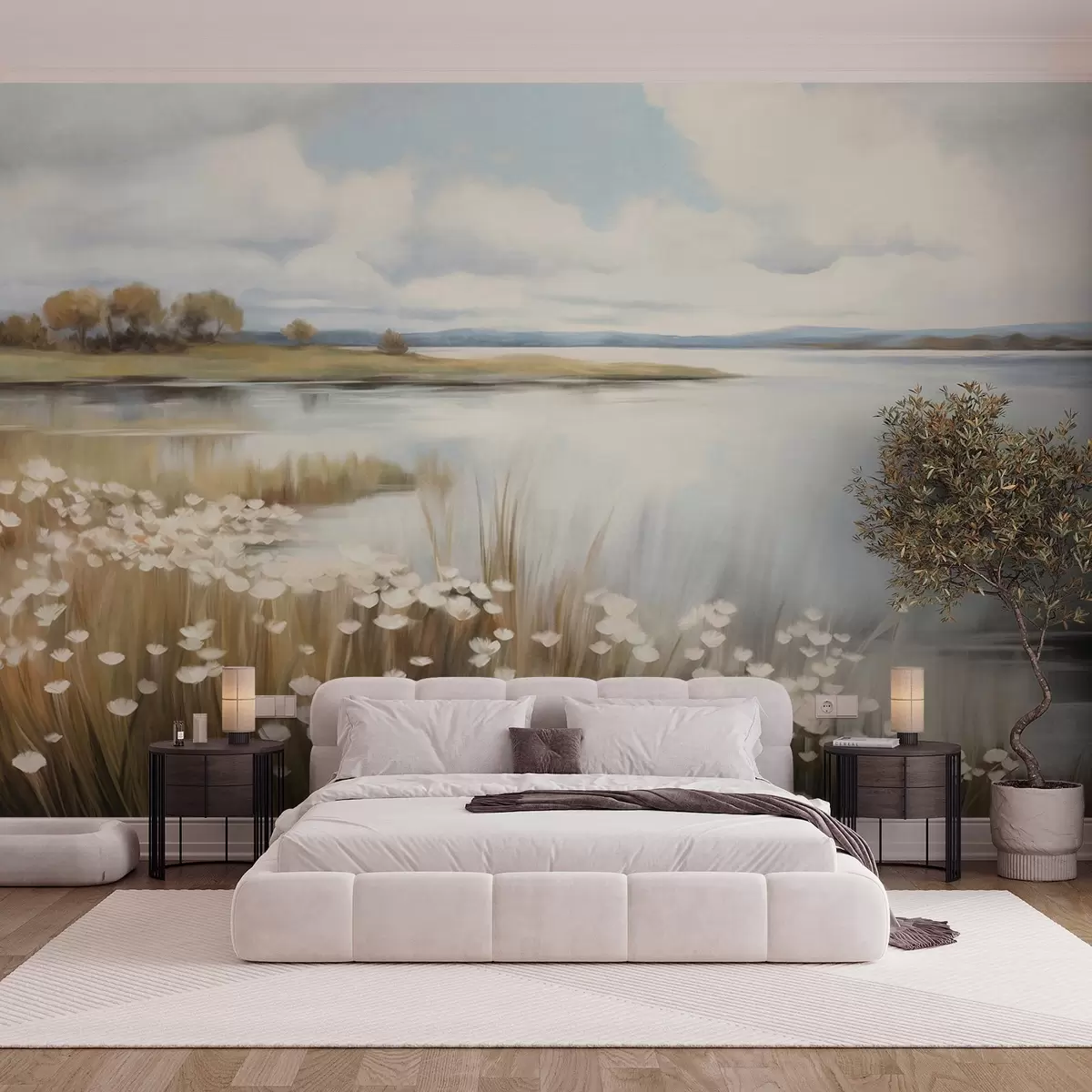 Fotomurales Paisaje con textura, campo de flores blancas y hierba alta, un lago al fondo, una colina cubierta de hierba con árboles, colores suaves Nr. w09530