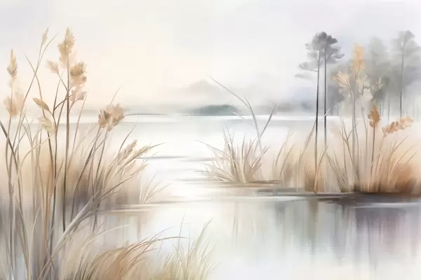 Fotomurales Paisaje con un lago y hierba alta en primer plano, montañas al fondo, colores suaves, textura. Nr. w09534