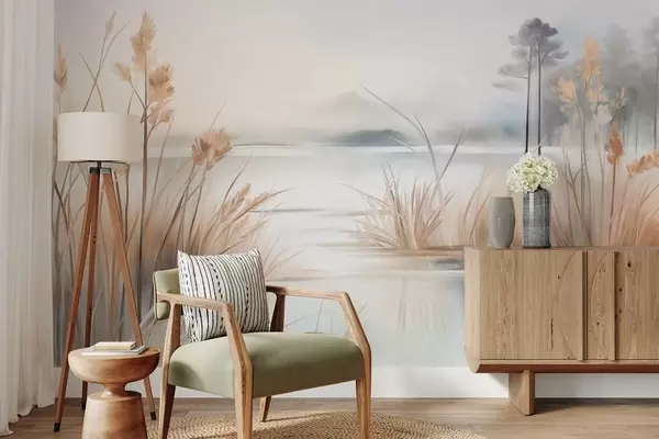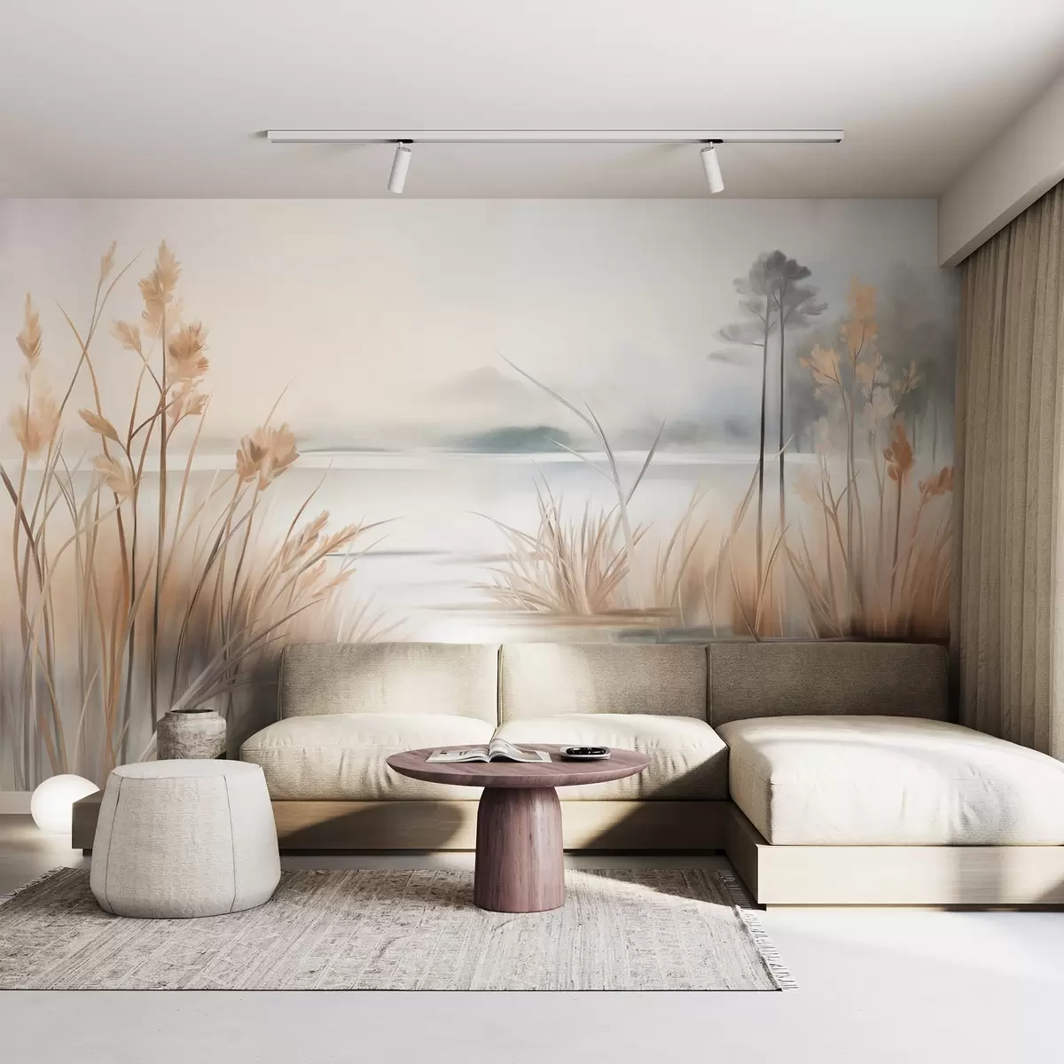 Fotomurales Paisaje con un lago y hierba alta en primer plano, montañas al fondo, colores suaves, textura Nr. w09534