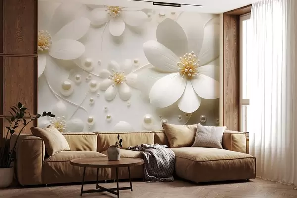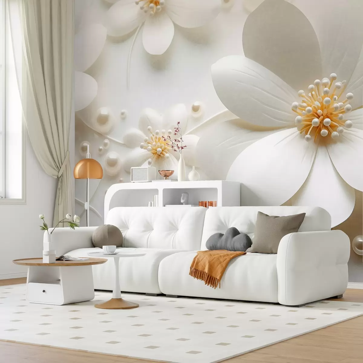 Fotomurales Flores blancas con perlas esparcidas sobre un fondo blanco, diseño elegante y minimalista, con textura Nr. w09535