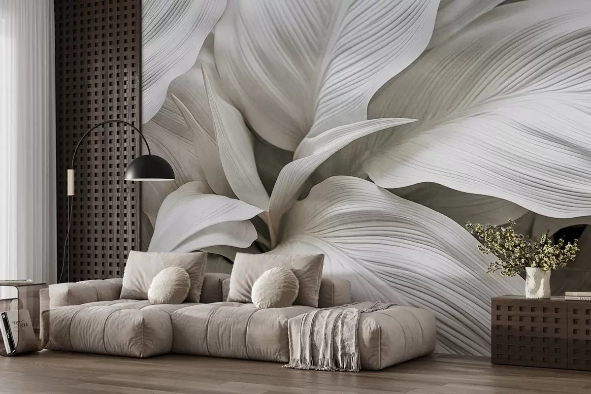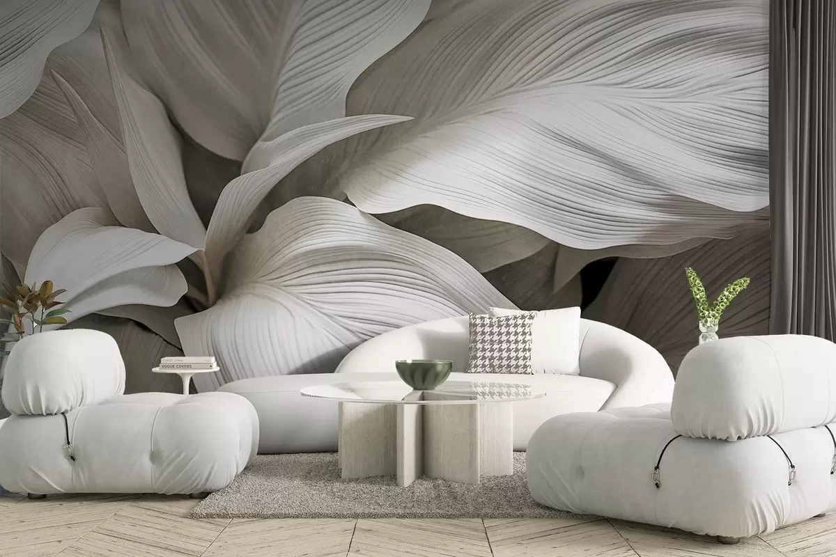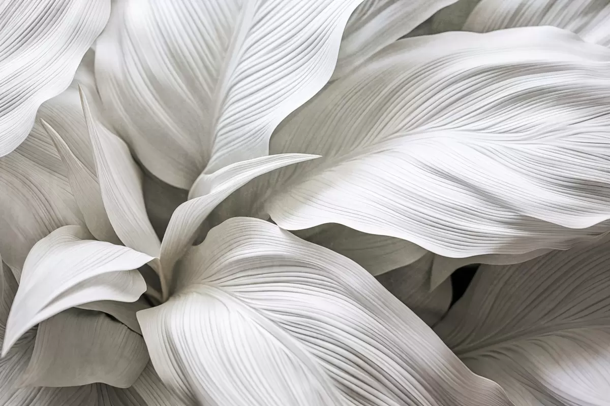 Fotomurales Hojas grandes, blancas y texturizadas, con nervaduras prominentes que se superponen y crean profundidad. Nr. w09536