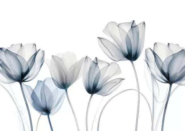 Fotomurales Flores de tulipán translúcidas de color azul y blanco con tallos largos, sobre un fondo claro, delicadas y con textura, arte floral. Nr. w09538