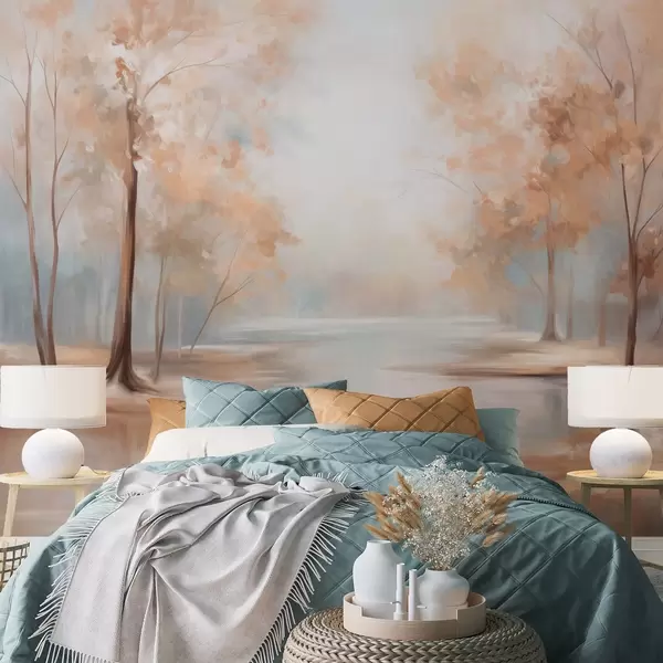 Fotomurales Paisaje otoñal con árboles y un río, colores suaves, atmósfera ligera y aireada, escena pacífica y tranquila Nr. w09541