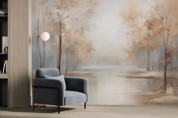 Fotomurales Paisaje otoñal con árboles y un río, colores suaves, atmósfera ligera y aireada, escena pacífica y tranquila Nr. w09541