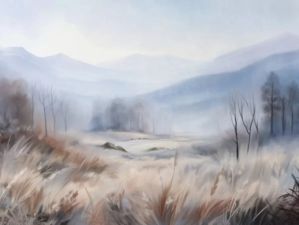 Fotomurales Paisaje con textura, con hierba seca en primer plano y árboles al fondo, con montañas en la distancia. Nr. w09542