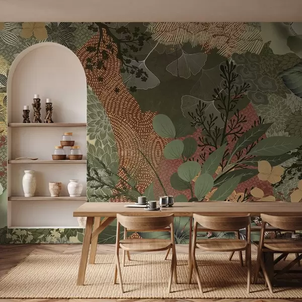 Fotomurales Collage abstracto con texturas de elementos botánicos, con hojas, flores y texturas orgánicas, en tonos verdes y marrones Nr. w09545