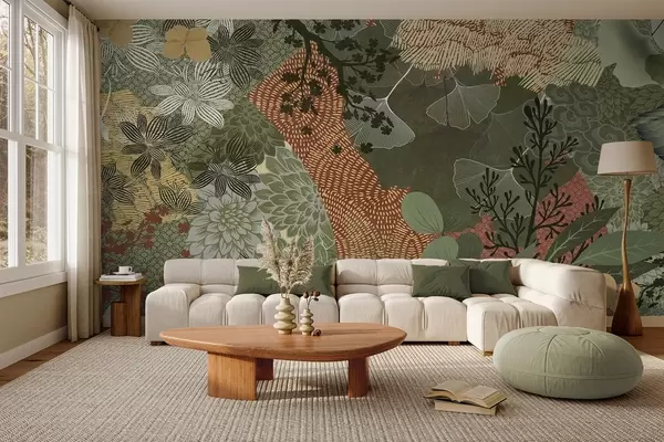 Fotomurales Collage abstracto con texturas de elementos botánicos, con hojas, flores y texturas orgánicas, en tonos verdes y marrones. Nr. w09545