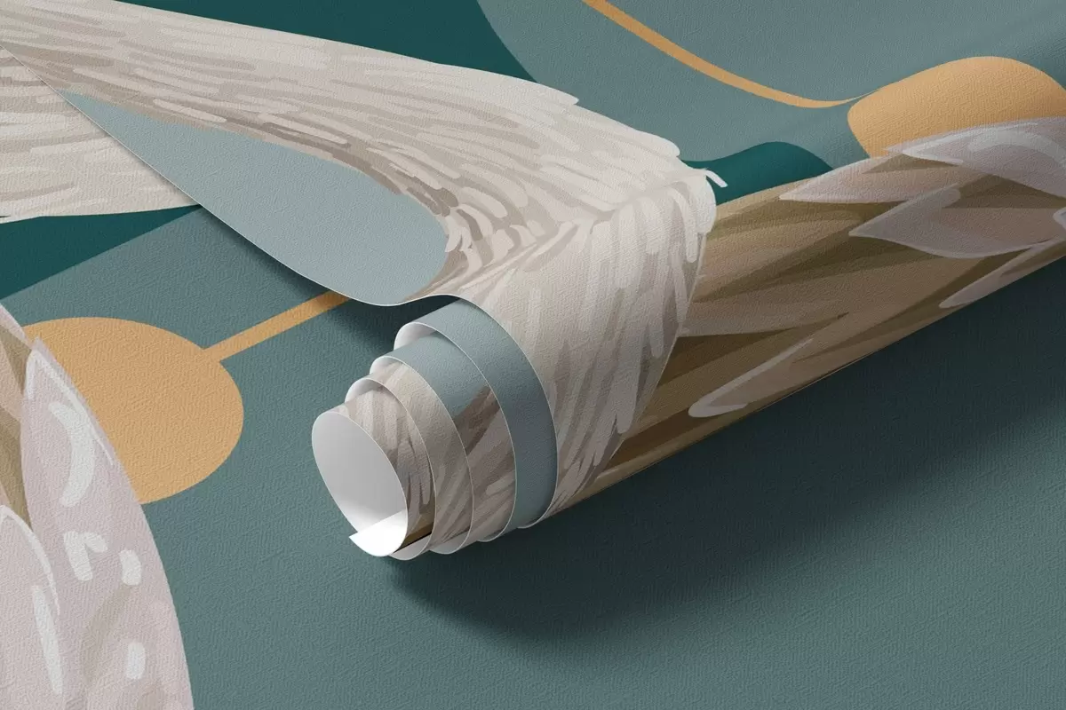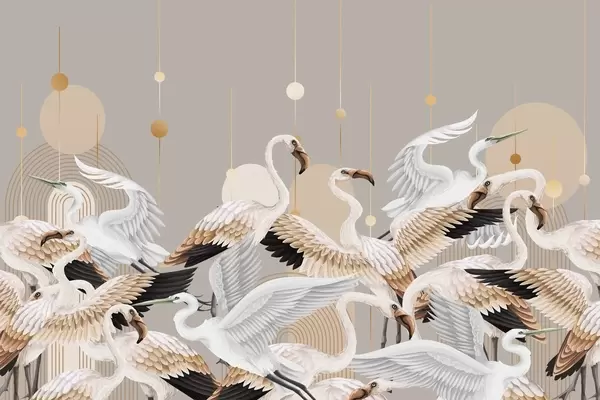 Fotomurales Una bandada de flamencos blancos con delicadas alas, sobre un fondo verde azulado oscuro con líneas y círculos amarillos. Nr. w09546