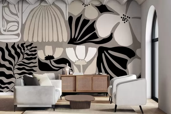 Fotomurales Flores y hojas estilizadas de estilo minimalista moderno en beige, negro y blanco, con textura sobre fondo gris Nr. w09547