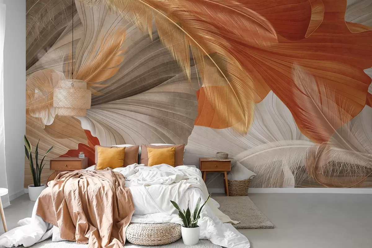 Fotomurales Formas abstractas grandes y fluidas con textura en colores crema y óxido con delicadas plumas amarillas, beige y marrones. Nr. w09549