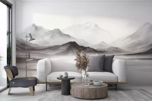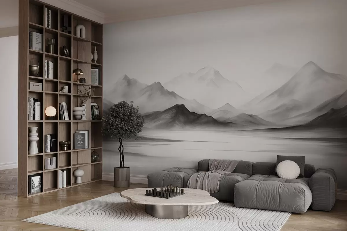 Fotomurales Un paisaje monocromático con textura, montañas brumosas y un lago en primer plano. Nr. w09555