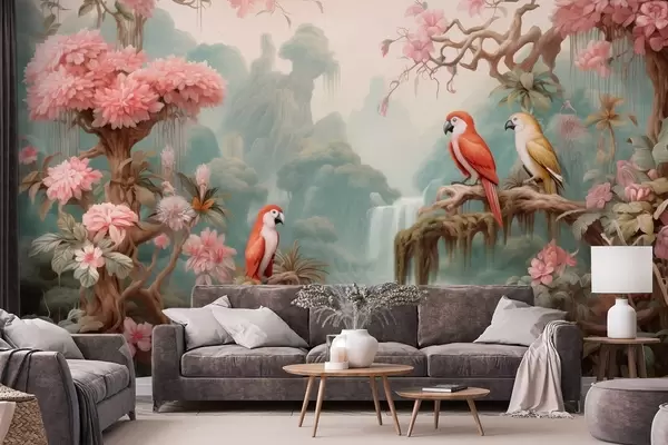 Fotomurales Un bosque tropical de cuento de hadas con loros, árboles en flor con flores rosas y una cascada. Nr. w09580