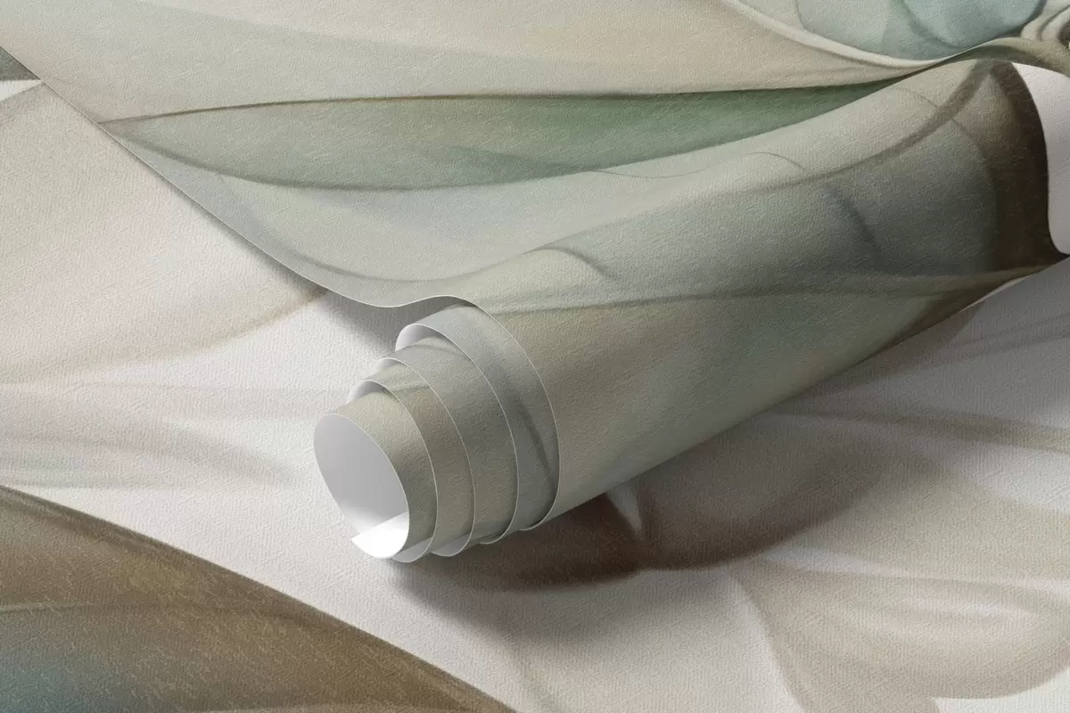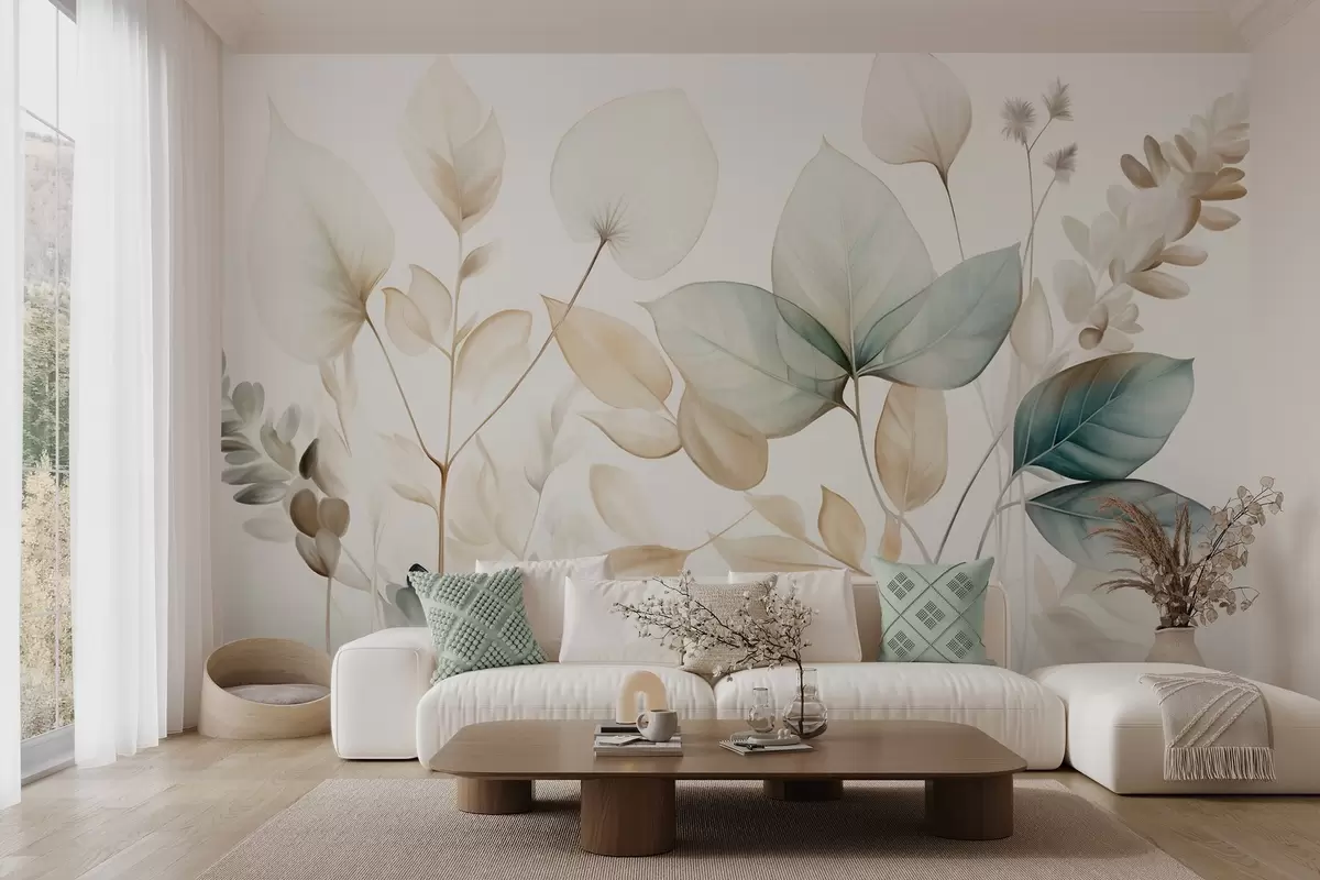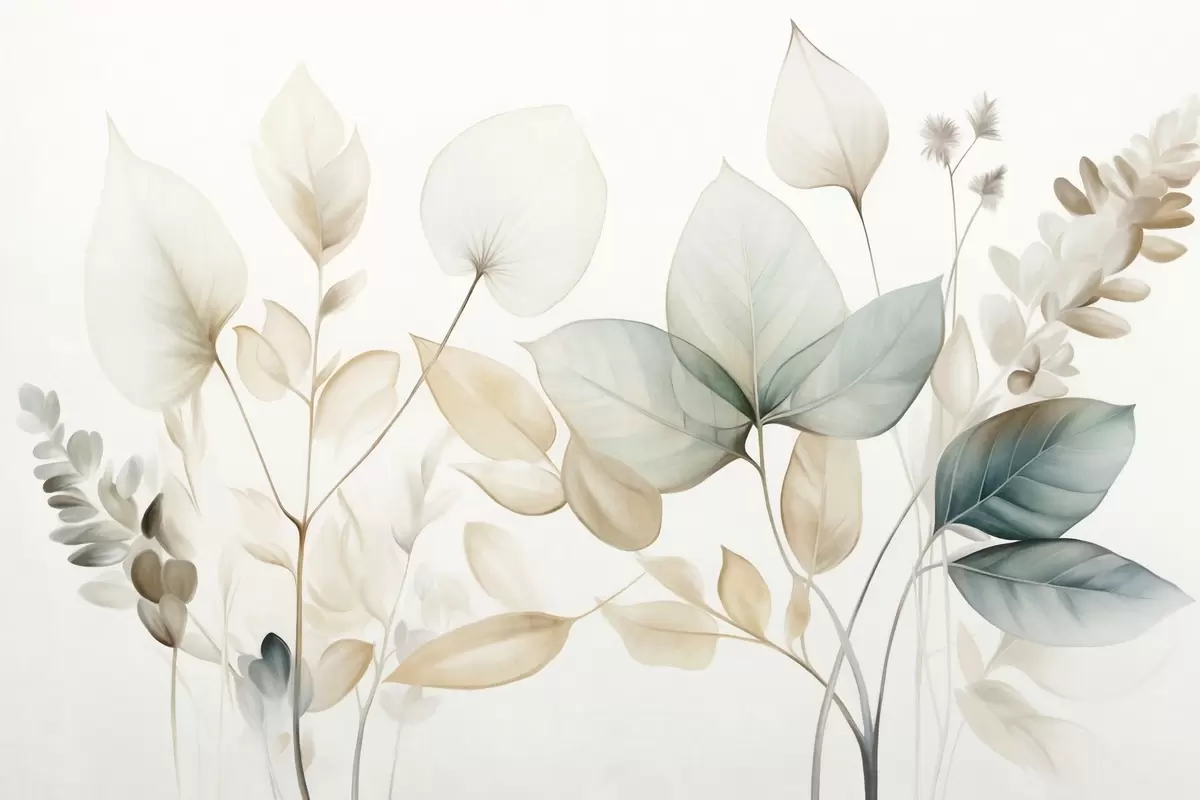 Fotomurales Hojas translúcidas con textura en tonos apagados de beige y verde azulado, con tallos delicados sobre un fondo suave y claro. Nr. w09583