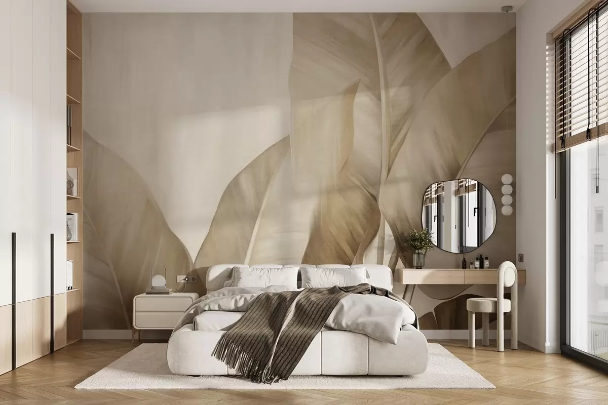 Fotomurales Hojas de plátano grandes y texturizadas de color marrón claro sobre un fondo beige claro, con una estética suave y minimalista. Nr. w09586