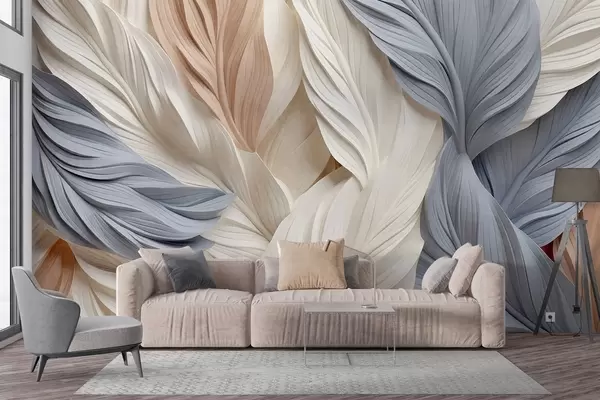 Fotomurales Plumas abstractas y en capas en tonos crema, beige y azul claro, con un aspecto texturizado y orgánico. Nr. w09603