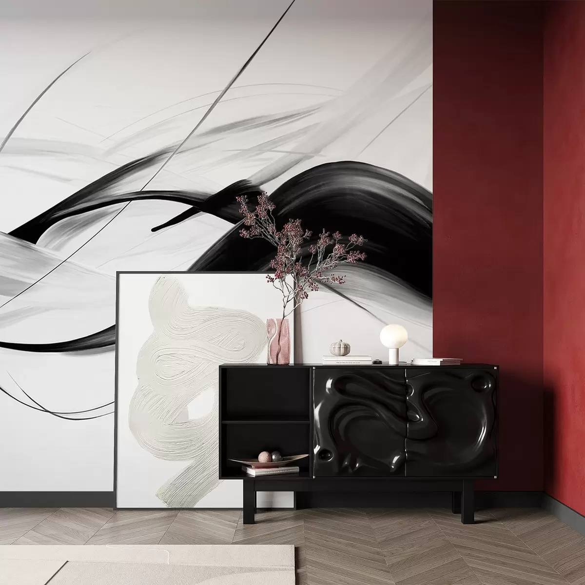 Fotomurales Pinceladas abstractas en blanco y negro con líneas finas que crean un diseño moderno sobre un fondo claro. Nr. w09605