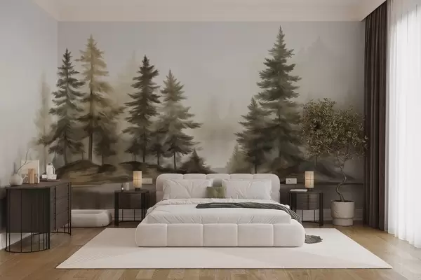 Fotomurales Un bosque brumoso con textura y altos pinos pintados de imitación. Nr. w09610