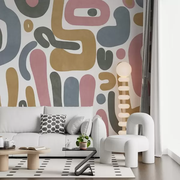 Fotomurales Formas abstractas con textura en rosa pastel, azul apagado, amarillo mostaza y gris sobre fondo blanco, arte moderno. Nr. w09620