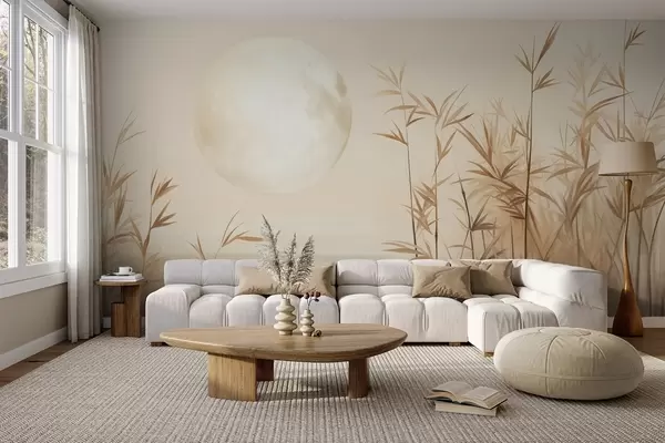Fotomurales Paisaje texturizado con altos juncos, lago y luna pálida en un cielo brumoso. Nr. w09631