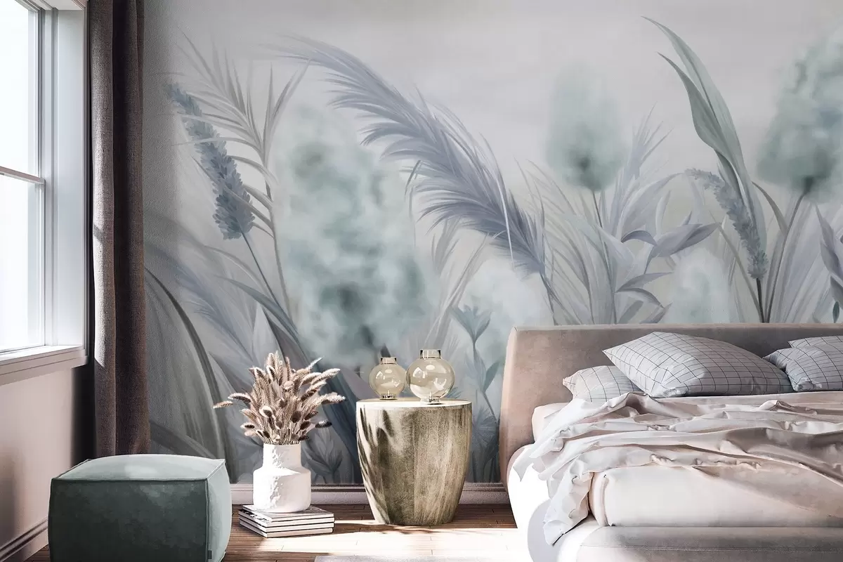 Fotomurales Hierba de la pampa azul y gris y otras flores secas con un cielo suave y brumoso al fondo. Nr. w09635v1