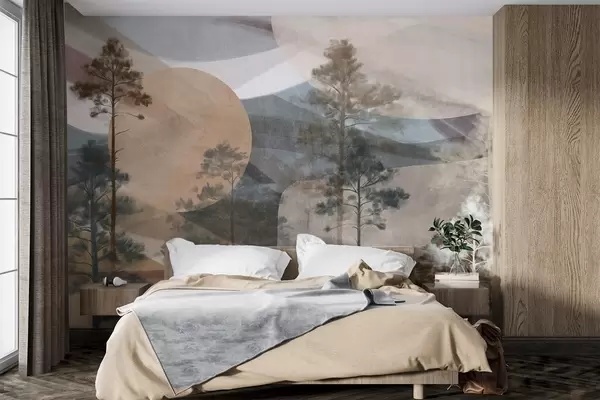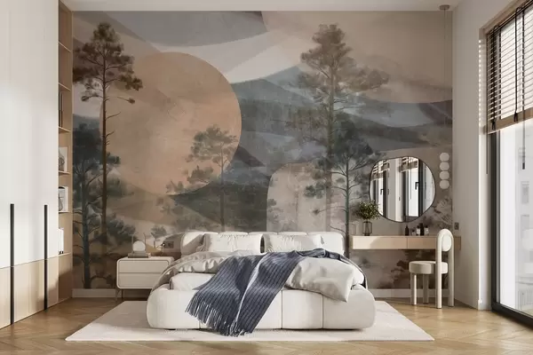 Fotomurales Altos pinos en un paisaje de textura apagada con formas circulares abstractas y montañas en capas en tonos terrosos. Nr. w09636