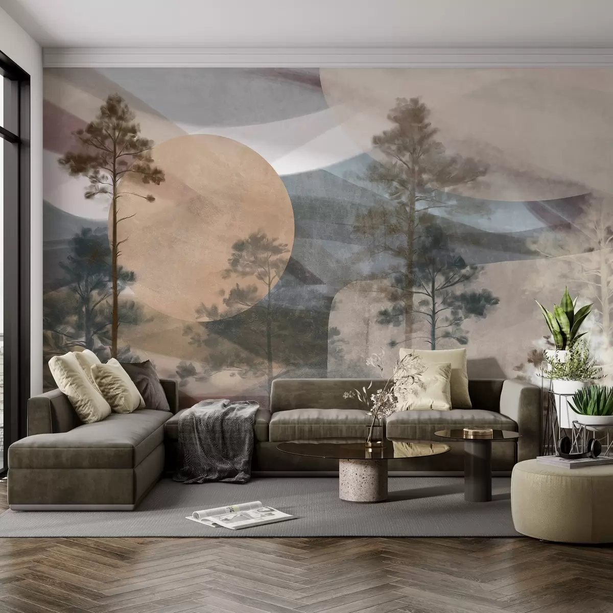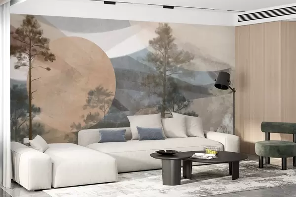 Fotomurales Altos pinos en un paisaje de textura apagada con formas circulares abstractas y montañas en capas en tonos terrosos. Nr. w09636