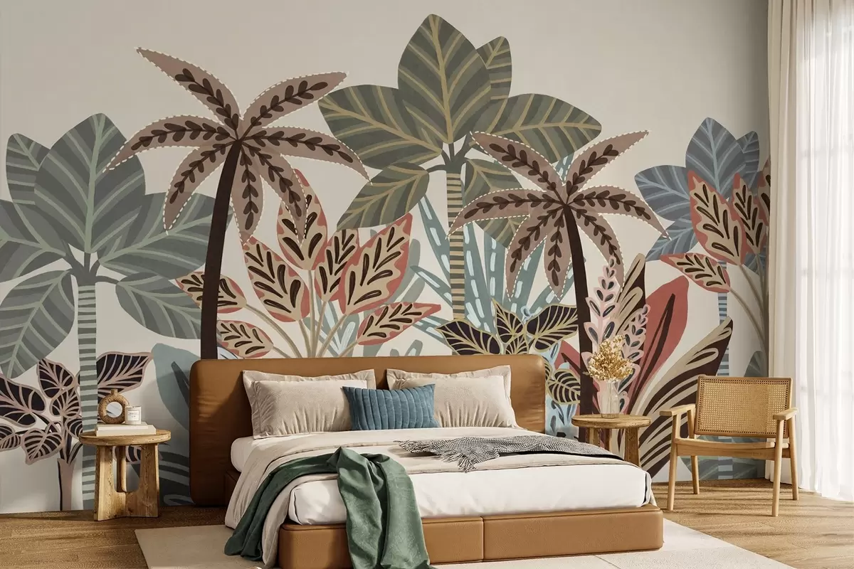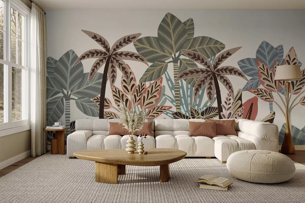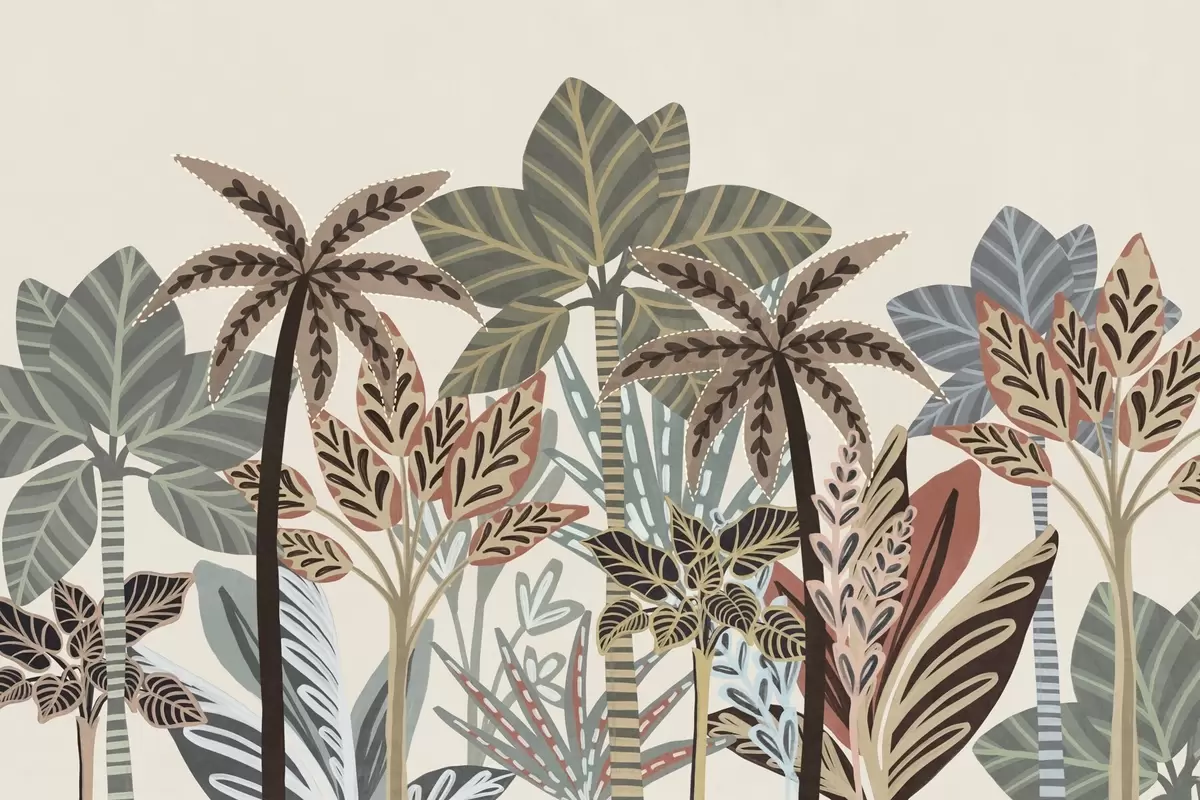 Fotomurales Plantas tropicales con textura y palmeras con colores apagados en estilo boho decorativo sobre un fondo crema. Nr. w09639