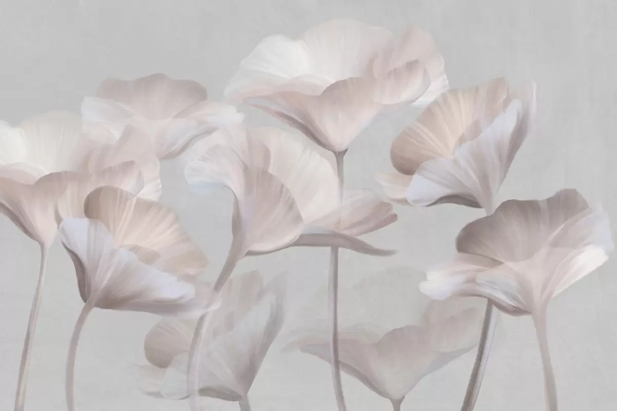Fotomurales Flores de loto translúcidas con textura de melocotón pálido y delicados pétalos sobre un fondo gris apagado. Nr. w09640