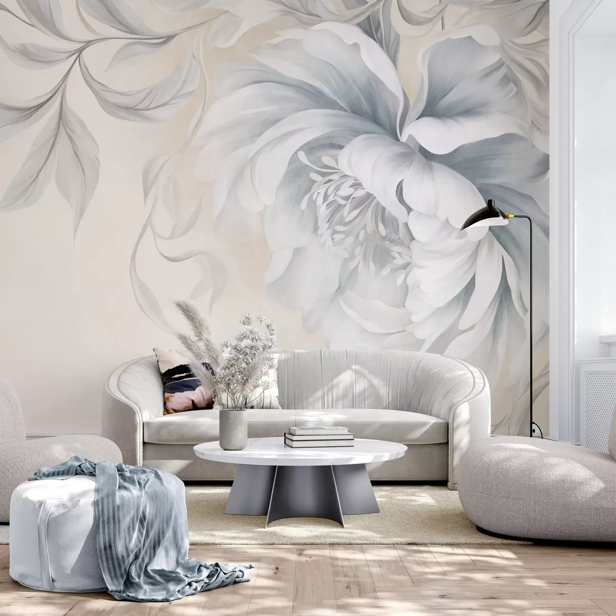 Fotomurales Peonía grande y con relieve, de pétalos delicados y hojas grises, pintada con un estilo suave Nr. w09647