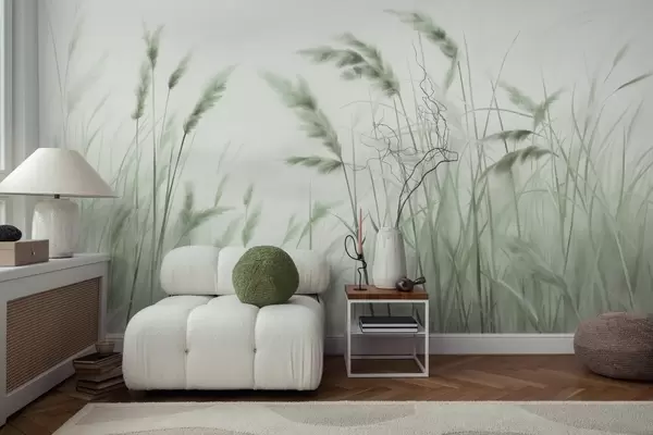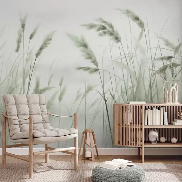 Fotomurales Hierba seca alta y texturizada con espigas de trigo en el campo sobre un fondo suave y pálido. Nr. w09648v1